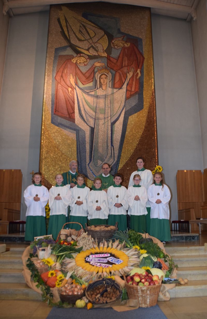 "Erntedankfest - und das in einem Jahr geprägt von Trockenheit, schlechten Ernten und Energieknappheit?" - Diesen Gedanken griff Pfarrer Heinrich bei der Feier des Erntedankfestes in der Pfarrkirche Leiblfing auf. Dass wir dennoch mehr als genug zu Danken haben, legten die Erstkommunionkinder mit ihren mitgebrachten Gaben dar. Der festliche Erntealtar, gestaltet vom Obst- und Gartenbauverein Mittleres Aitrachtal in Form einer Sonnenblume, wurde noch ergänzt durch Danksagungen für vier immaterielle Gaben: Unsere Gesundheit ist mit Geld und Materiellem nicht zu bezahlen. Als Christen sind wir jedoch über die irdische Gesundheit hinaus dankbar für unseren Glauben und die Orientierung auf das Jenseits. Als Menschen sind wir dankbar für unsere Familien und Freunde. Als Zeichen dafür waren auch die acht Ortsvereine OGV Mittleres Aitrachtal, DJK Leiblfing, FFW Leiblfing, FFW Eschlbach, FFW Ober- und Niedersunzing, KDFB Leiblfing, Schützenkameradschaft Eschlbach und Krieger-Reservisten-und Soldatenkameradschaft Leiblfing mit ihren Fahnenabordnungen vertreteten. Und gerade der Friede ist wichtig in Anbetracht der Konflikte um uns herum.