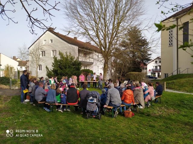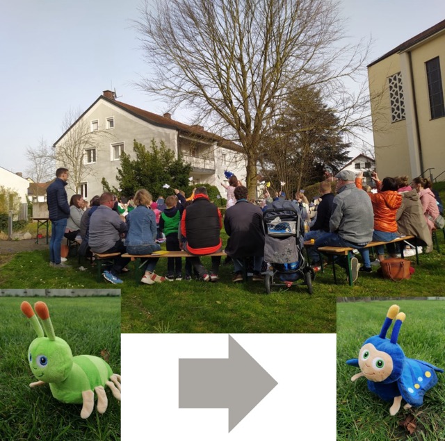 Am Karsamstag versammelten sich ca. 45 Kinder mit ihren Eltern im Pfarrgarten, um bei herrlichstem Frühlingswetter die Auferstehung Jesu zu feiern. Als Symbol dazu diente eine Raupe, die sich am Gartenzaun verpuppte und wie tot da lag. Aber nach ein paar Tage wackelte und ruckelte der Kokon und heraus kam ein wunderschöner Schmetterling. Im Anschluss an die Geschichte bemalte jedes Kind einen eigenen Schmetterling, mit dem es zu dem Lied "Wäre ich ein Schmetterling" tanzen durfte. Nach den Fürbitten und dem Segen hatte der Osterhase für jedes Kind ein buntes Ei versteckt.