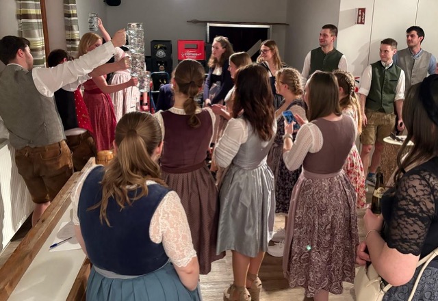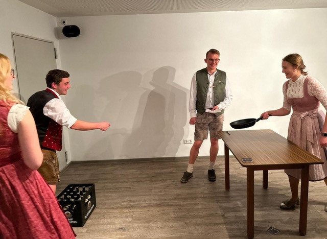Hübsche Dirndl der Mädels und die feschen Lederhosen der Buben zeigten am Samstagabend, dass es im Hailinger Jugendheim bayrisch zuging: Darüberhinaus gab es bayrische Musik, lustige Spiele und frischen Leberkäse. Geplant und organisiert wurde dieser bayrische Abend vom Sachausschuss Jugend des Pfarrgemeinderates zusammen mit den Landjugendvorständen von Hailing, Leiblfing, Metting und Schwimmbach.Nach einer Vorstellungsrunde aller Teilnehmer gab es einen „bayrischen Fünfkampf“. Johannes Stuhlfelner als Vorsitzender der gastgebenden Landjugend durchmischte mittels Spielkarten die Jugendlichen und bildete neun Vierergruppen.