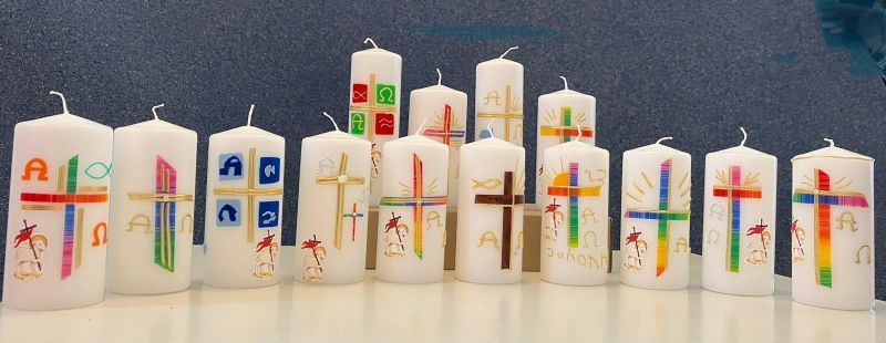 Nach der Anfertigung einer Skizze machen sich die Künstler ans Werk und schnitten fleißig Alpha und Omegas aus Wachs aus, verzierten die Kerzen mit Kreuzen, Strahlen und Osterlämmern. Die Ergebnisse können sich wahrlich sehen lassen und die Kinder verließen voller Stolz mit ihren Kerzen das Pfarrheim.