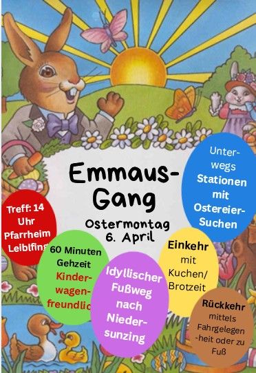 Wir gehen um 14 Uhr beim Leiblfinger Pfarrheim weg Richtung Niedersunzing. Während des Spaziergangs werden kurze Stationen gemacht, wo der Osterhase für die Kinder etwas versteckt hat und wo’s Impulse zum Emmausgang gibt. Nach einer kurzen Andacht in der Niedersunzinger Martinskirche stärken wir uns mit Kaffee, Kuchen und Wienerwürstl. Dann geht’s wieder nachhause. Der Weg ist für Kinderwägen geeignet. Wer noch länger sitzen bleiben oder mit dem Auto heimfahren will, kann das jederzeit tun.