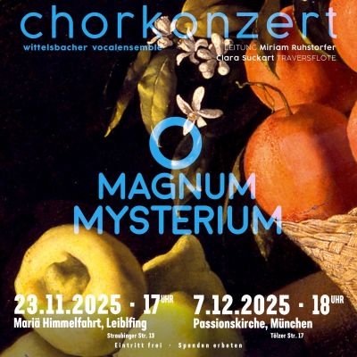 Am Sonntag, den 23. November 2025, um 17 Uhr gastiert das Wittelsbacher Vocalensemble aus München unter der Leitung von Miriam Ruhstorfer erneut in der Pfarrkirche Mariä Himmelfahrt Leiblfing. Unter dem Titel „O magnum mysterium“ erklingt ein stimmungsvolles vorweihnachtliches Programm mit Chormusik von Gjeilo, Britten, Chilcott u. a. Um eine Spende zur Deckung der Unkosten wird gebeten.