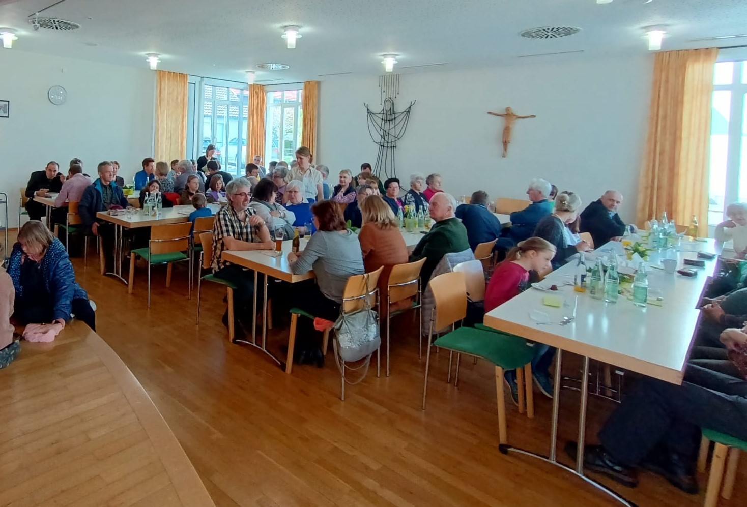 Sogar im Freien wurden noch zwei Tische aufgestellt, weil der Pfarrsaal die Leute nicht fassen konnte, die am vergangenen Sonntag, 17. März, zum Fastenessen gekommen waren. Viele Landfrauen hatten am Vortag in der Schulküche über 30 Kilo Kartoffel geschält und geschnitten, um daraus mit weiteren Gemüse und Gewürzen eine köstliche Kartoffelsuppe zu bereiten. Frauen vom Frauenbund, dem Pfarrgemeinderat und der Pfarrei hatten Torten und Kuchen gebacken. Der Erlös des Suppen- und Kuchenverkaufs kommt der Fastenaktion Misereor zugute. Deswegen war auch Margot Rodriguez, eine Vertreterin von Misereor München zu Gast und erzählte zwischen Hauptspeise und Kaffee und Kuchen den Besuchern, welche Hilfsprojekte durch diese Spenden unterstützt werden. "Hilfe zur Sebsthilfe" ist eines der Leitsätze von Misereor. So werden z.B. die Kaffeebauern in Kolumbien unterstützt, damit sie durch durch ihre eigene Arbeit ihre Familien ernähren und ihre Kinder in die Schule schicken können. Bildung ist einer der wichtigsten Schlüssel, um den Teufelskreis der Armut zu entkommen. Einer dieser Kaffeebauern hatte letzte Woche, am 12. März, Leiblfing besucht und berichtet, wie ihm geholfen wurde, damit er auf seinem zwei Hektar großem Land in den Bergen für seine Familie den Lebensunterhalt verdienen und gegen die Großgrundbesitzer bestehen kann.