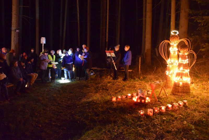 Eine idyllische Weihnachtswanderung mit Andacht im Wald wurde am 29.12. veranstaltet. Organisiert von den Hailinger Pfarrgemeinderäten, wurde dieses Jahr das Motto „Engel“ ausgewählt. Zum Abmarsch an der Hailinger Kirche sowie an drei weiteren Stationen auf dem Weg wurden dazu passende Texte vorgelesen und Lieder gesungen. Das Ziel der Wanderung war eine kleine Lichtung im nahegelegenen Wald beim Wissinger-Hof. Diese war in weihnachtlichem Ambiente mit Kerzen beleuchtet. Zwei von Monika Lehermeier kreierte, lebensgroße leuchtende Engel-Figuren stellten das Motto figürlich dar. Die dann stattfindende Andacht wurde vom Hailinger Chor, mit Geige und Querflöte musikalisch umrahmt. „Jeder kann ein „Engel“ sein und mehr Frieden und Menschlichkeit in die Welt bringen!“, fasste Pfarrer Leo Heinrich am Ende die Texte zusammen und bedankte sich bei den Organisatoren und Teilnehmern. Zum Ausklang gab es noch eine kleine Stärkung mit Punsch, belegten Broten und Süßem, bevor sich jeder auf den Nachhauseweg durch die Nacht machte.
