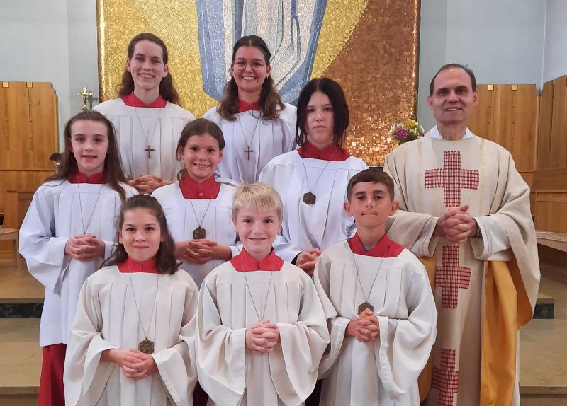 Bild (von Luisa Haider) zeigt die neuen Ministranten mit den beiden Oberministraten (hinten) und der ausgeschiedenen Ministrantin Sarah Kallusek (links neben Pfr. Leo Heinrich)
